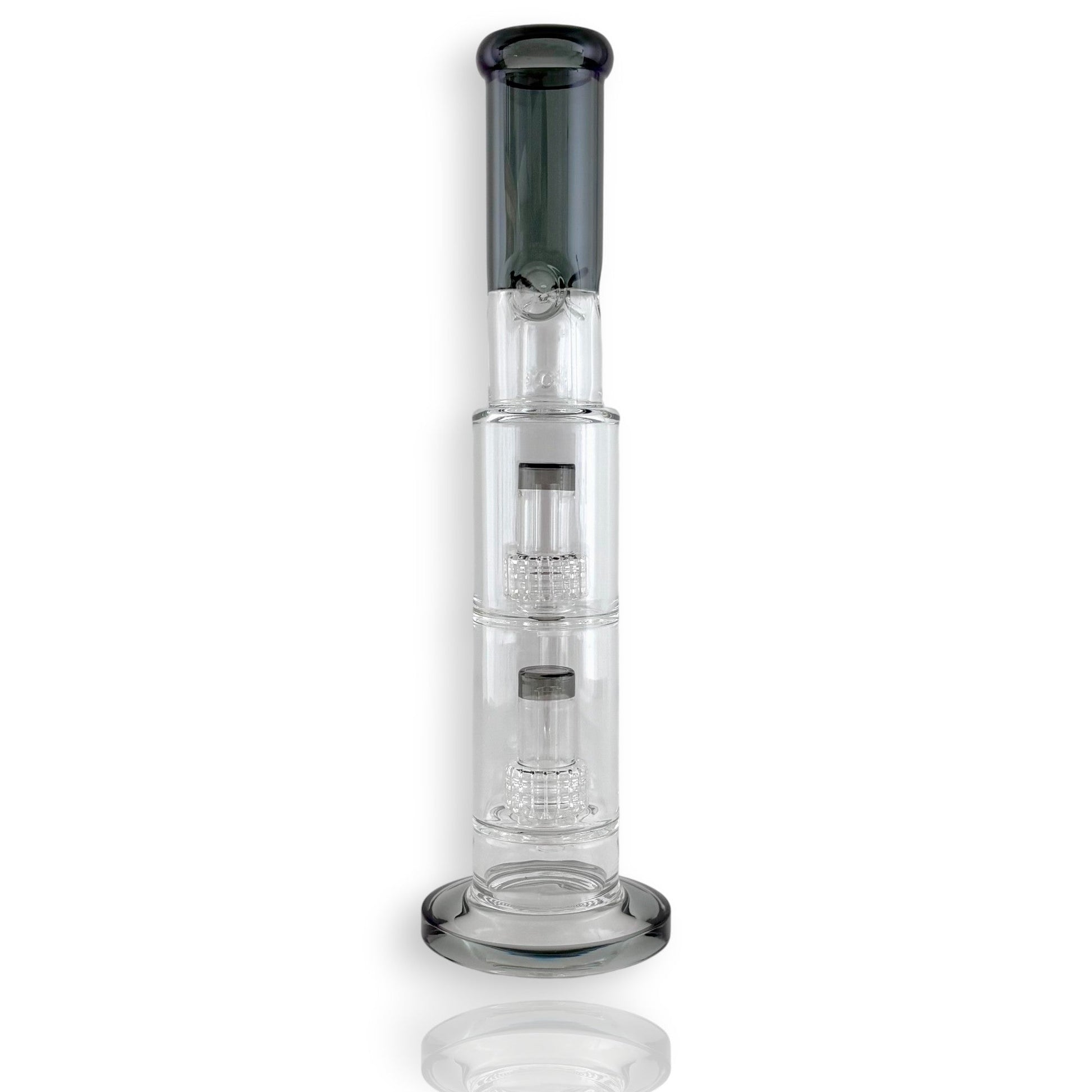 This 17-inch straight shooter water pipe is engineered for clean, powerful hits with advanced percolation. Its clear borosilicate glass body showcases the filtration system, while the grey-colored mouthpiece adds a sleek accent to the overall design.