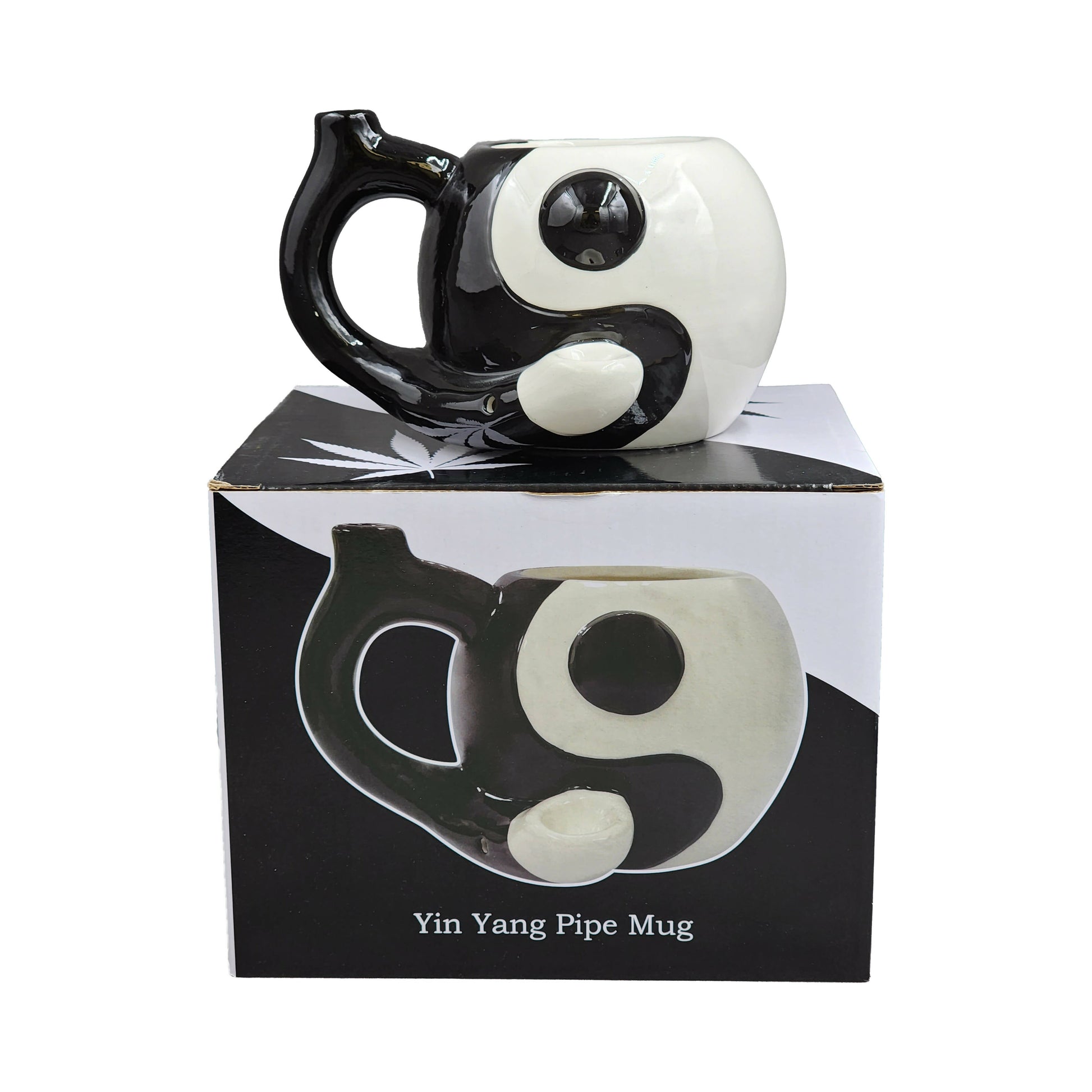 The Yin and Yang mug is fully functional with a pipe and mouthpiece. The pipe is attached to the front of the mug where you can pack your tobacco and light it. Smoke filters up the hollow handle to the mouthpiece on the top. This product is recommended for adult use only. The mug comes in a colored gift box, making a fabulous gift idea to offer to like-minded friends.